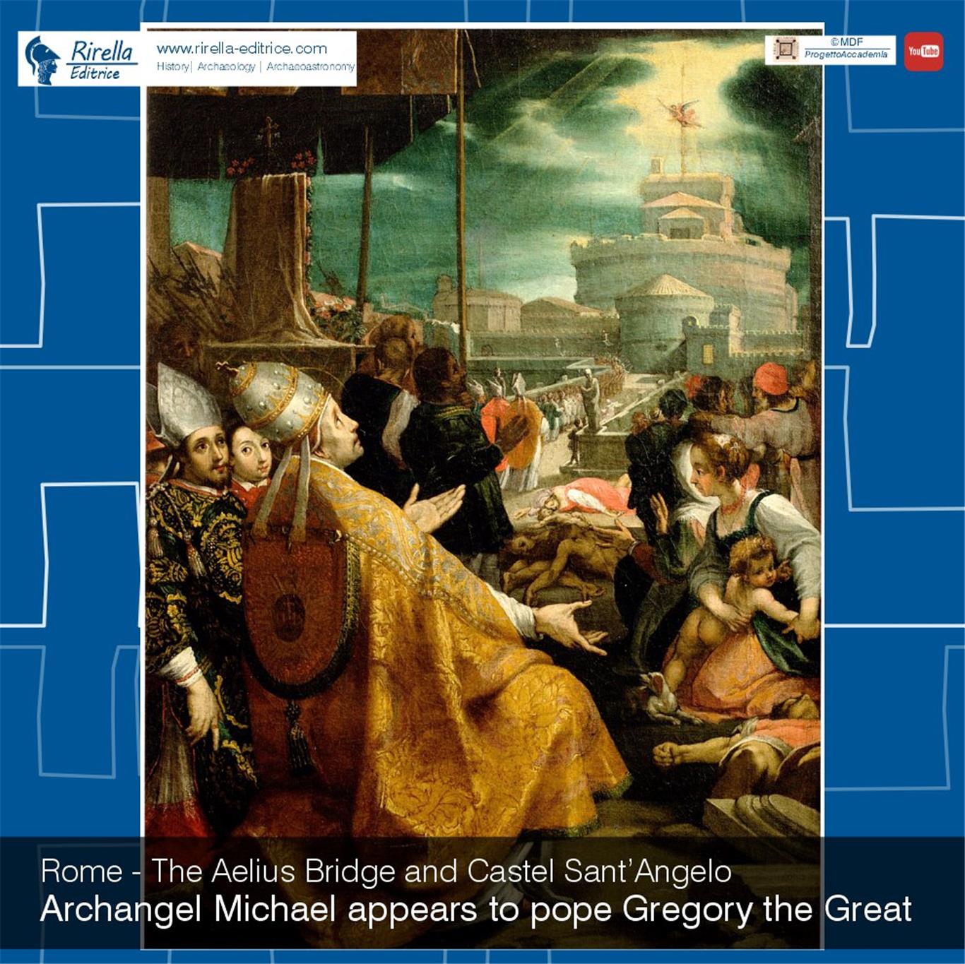 While he was on the Pons Aelius, the Archangel Michael appeared to him on top of the Mausoleum, sheathing his sword.