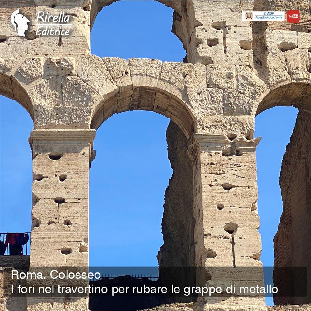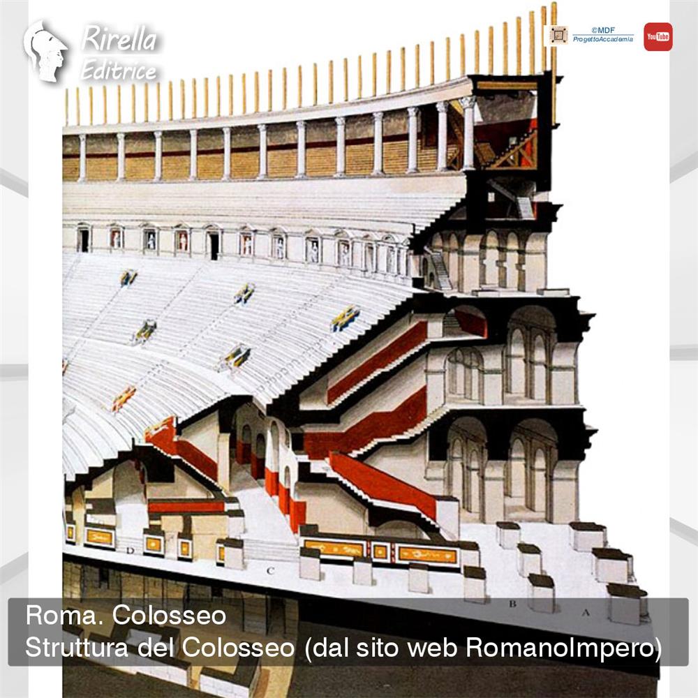 Il Colosseo visto dall’esterno ha quattro piani: i primi tre hanno arcate incorniciate da semicolonne con capiteli tuscanici, ionici e corinzi, con pareti via vi più sottili per ridurre i pesi.