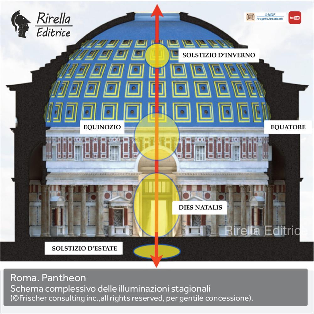 Il Pantheon come abbiamo spiegato numerose volte nei nostri post, funzionava come una gigantesca meridiana. Ogni giorno al mezzogiorno solare (13:00 orario estivo) il Sole entra dall'oculo della cupola e proietta un Cerchio di Luce in direzione del portale. Tale cerchio ha altezze diverse a seconda delle stagioni, quindi era un indicatore calendariale.