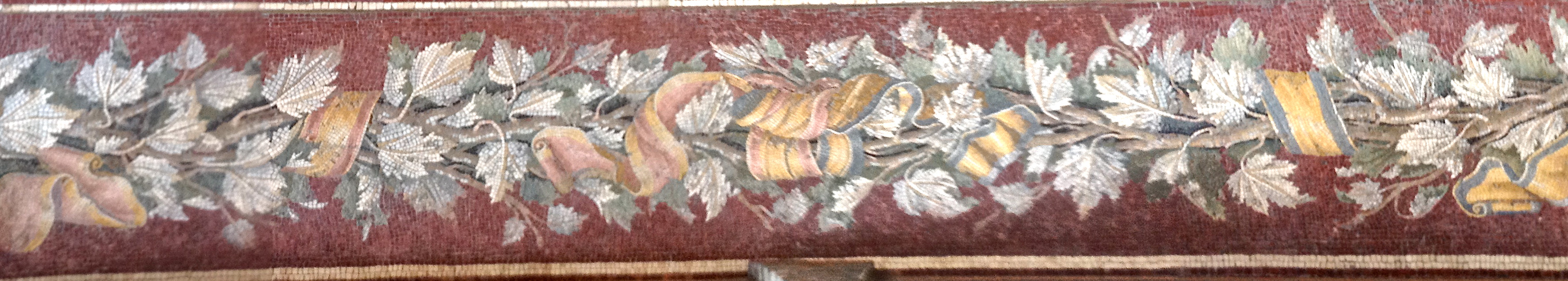 ✅ Il terzo pannello ha i simboli di Dioniso: un leopardo che addenta uno strumento musicale, un kantharos e un maschera coronata da foglie di vite. L'ultimo mosaico ha un paesaggio idillico con cinque capre, un laghetto ed un piccolo sacello davanti al quale è seduto Dioniso.