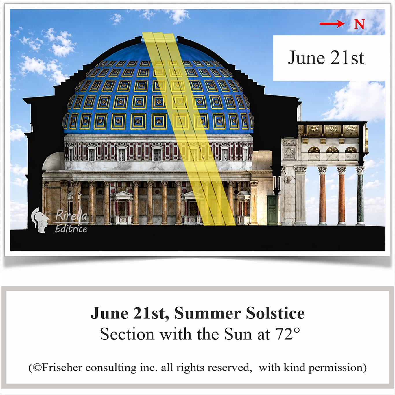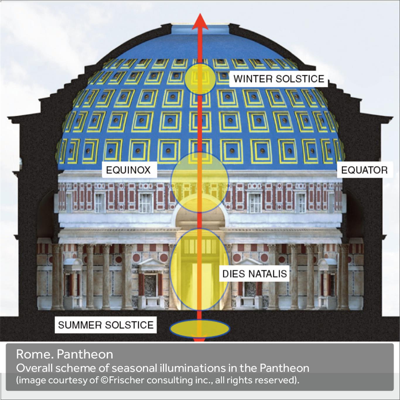 The Pantheon is a huge spherical sundial, where every day at noon the sun enters through the dome's oculus and creates a Circle of Light that illuminates the side towards the portal.