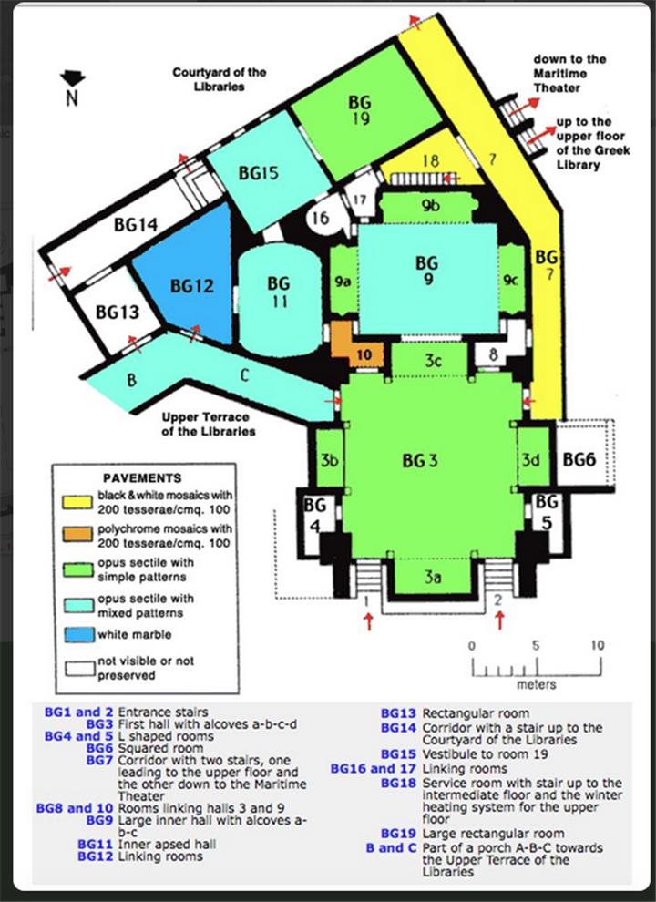 Given that the heating systems in non-thermal buildings exist only in very few ones of the Villa, it is likely that the Greek Library was used by the emperor as a winter residence before the construction of the Winter Palace (n. 33), which similarly had a heating system for winter.