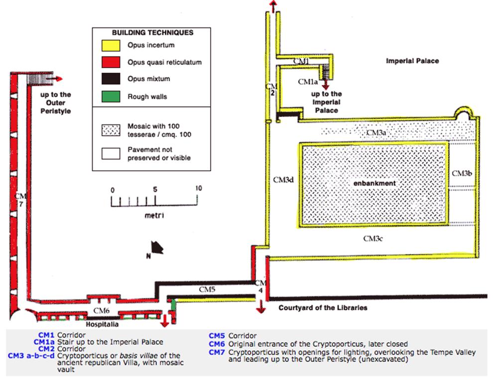 The Cryptoporticus CM3 is rectangular (27.60 x 17.50 m) with four subterranean corridors a-b-c-d, covered by barrel vaults, which receive light from the outside through window-tunnels.