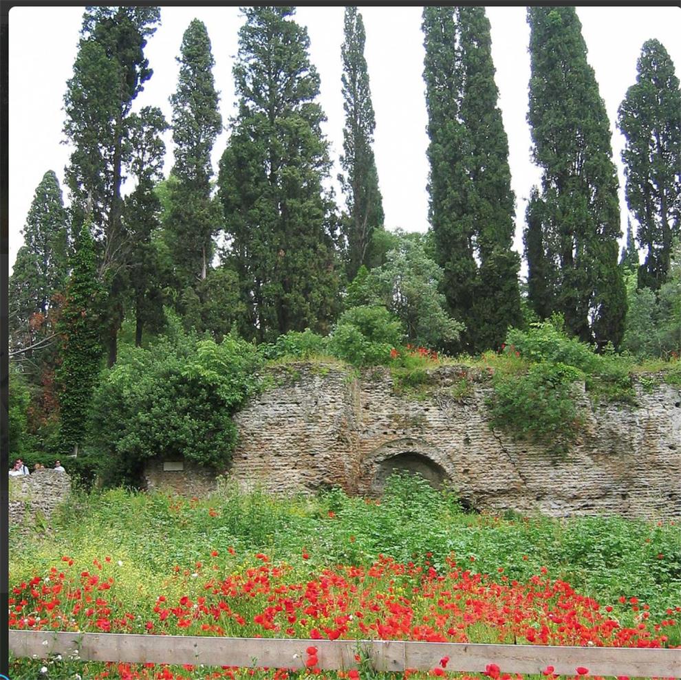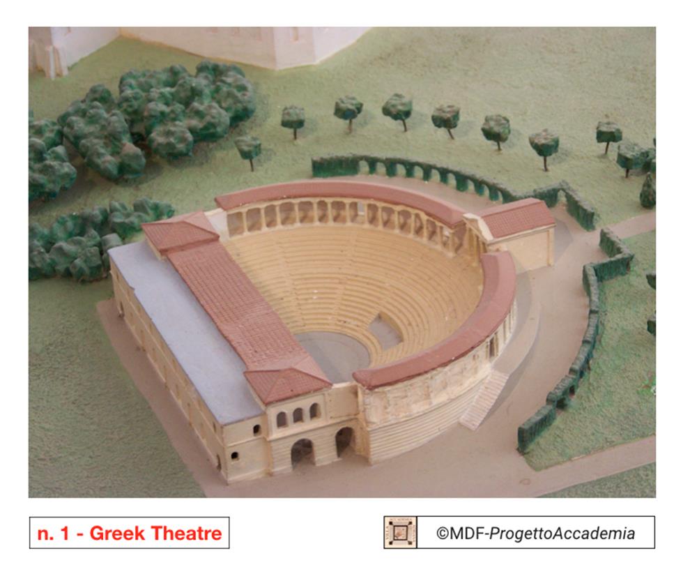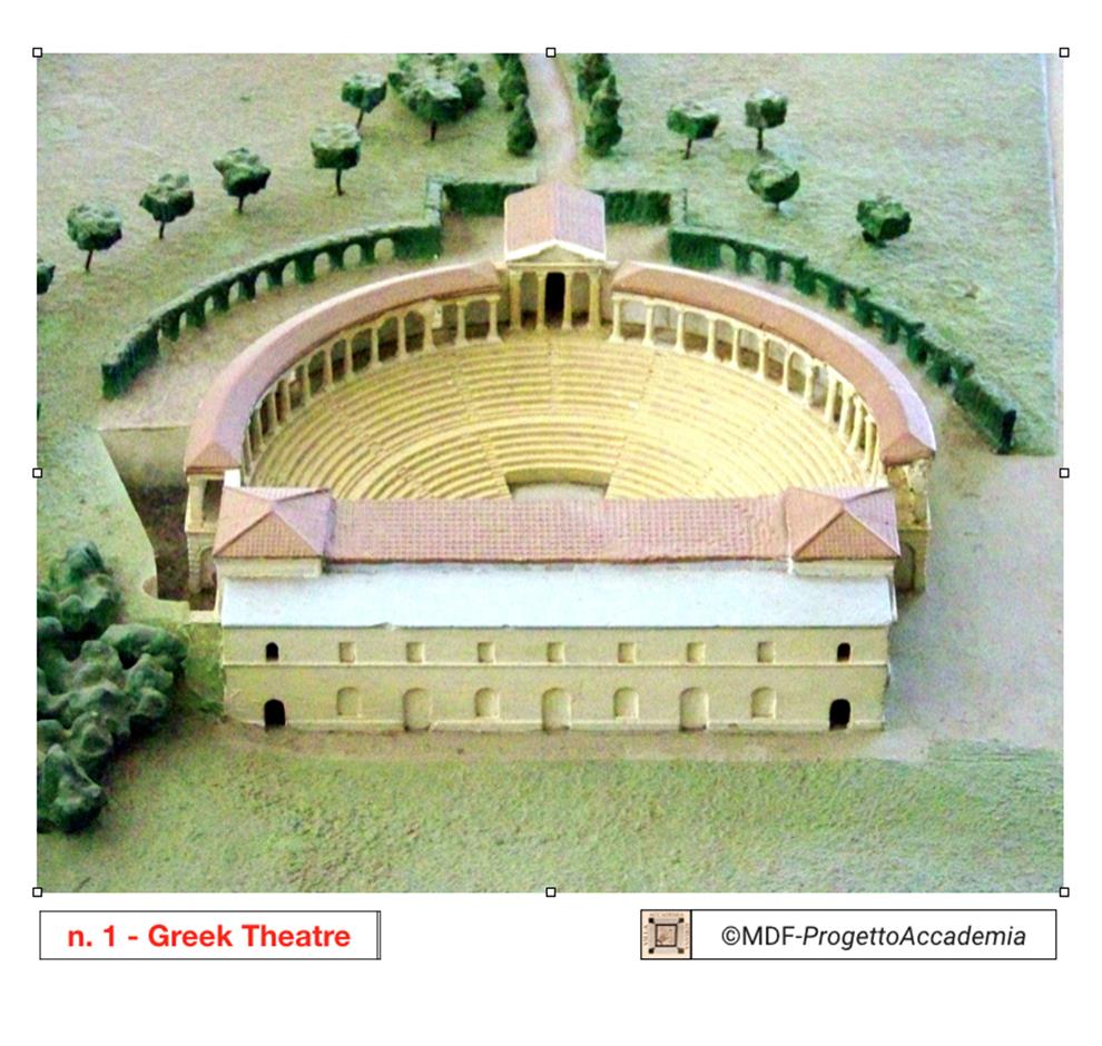 According to the antiquarian plans, starting from the one by Contini (1668), next to the Greek Theatre there was a rectangular square [n. 1b], surrounded by a portico.