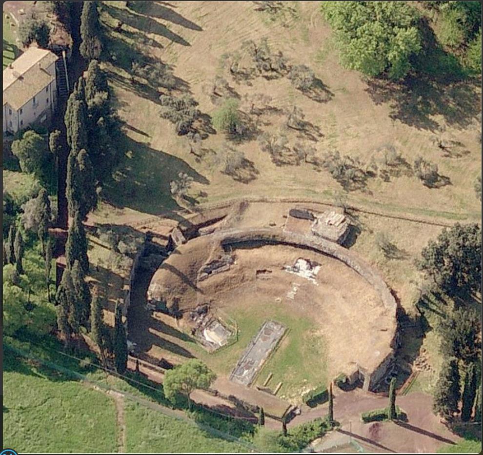 Entering the Villa and turning left into a walkway flanked by cypresses, the path goes along the Valley of Tempe reaching the Greek Theatre, which was excavated in recent years by the Pablo Olavide University of Seville (Spain) with Rafael Hidalgo Prieto and Pilar Leon [see bibliography].