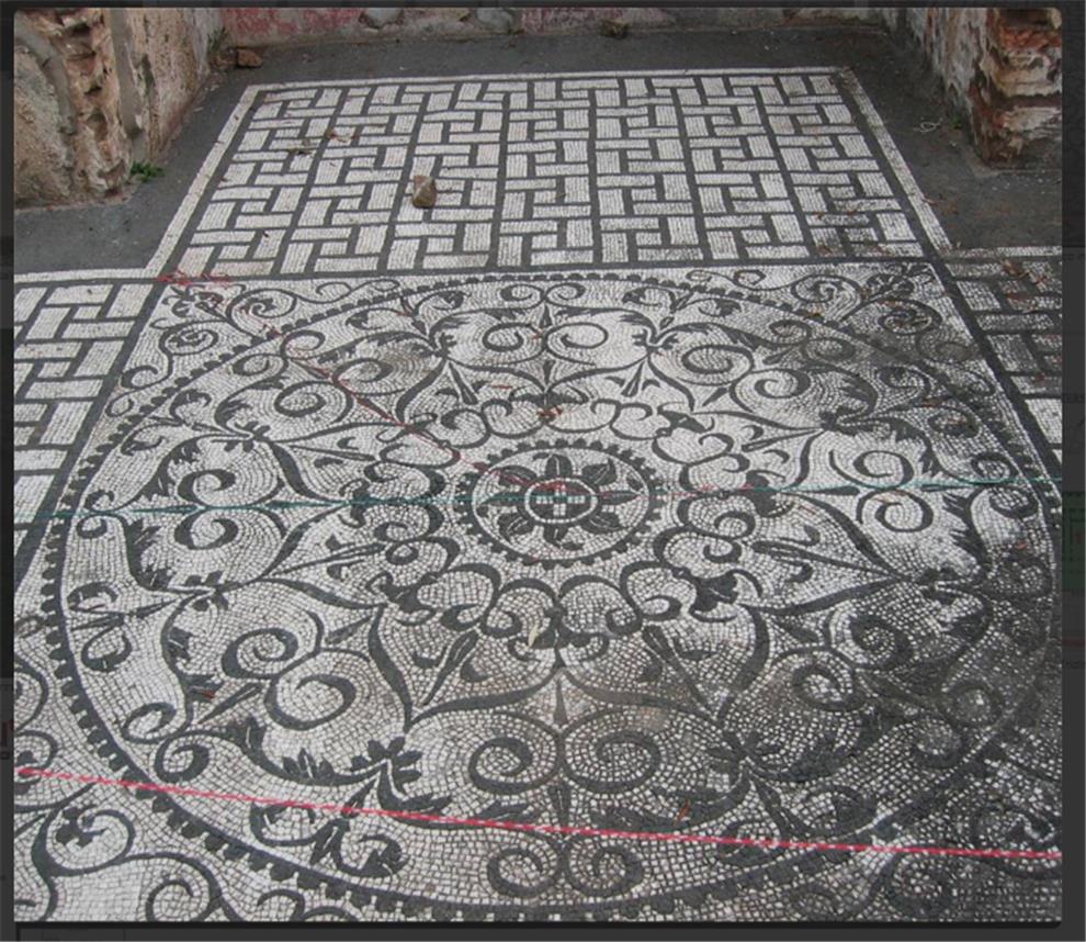 Their black and white mosaic pavements have a square central field with a more refined decoration, arabesques and floral motifs. The three rectangles corresponding to the alcoves have simpler geometric designs, given that they were partly hidden by the beds.