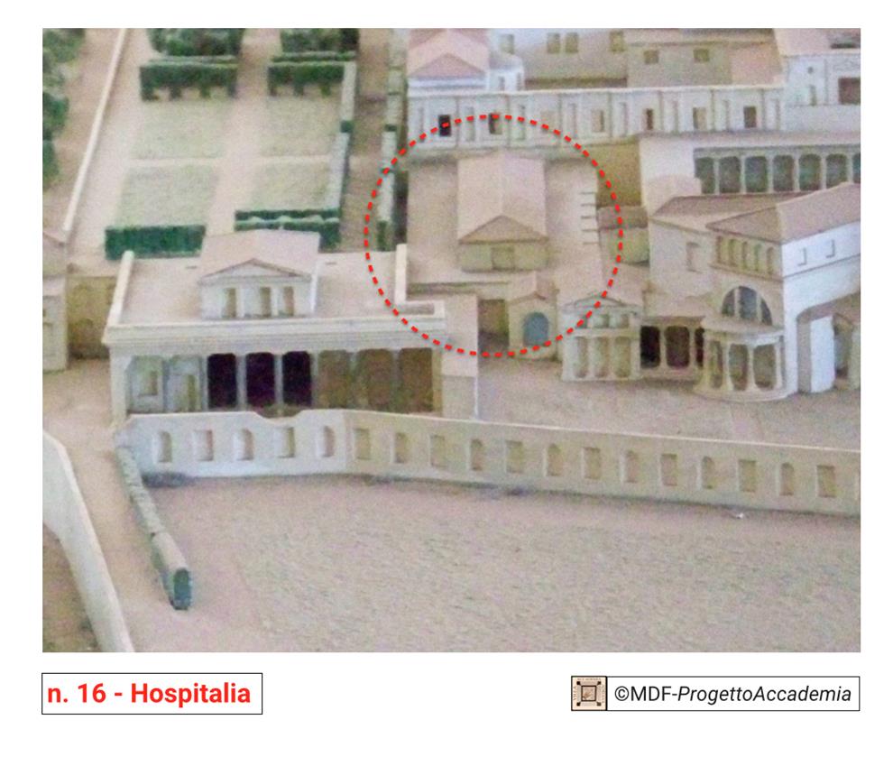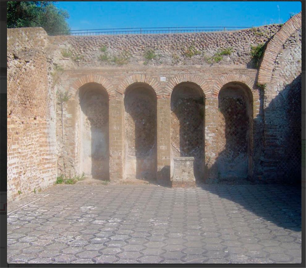 The ten cubicles with alcoves for the beds and latrines show that this building was a dormitory, while the nearby Imperial Triclinium was the living area.