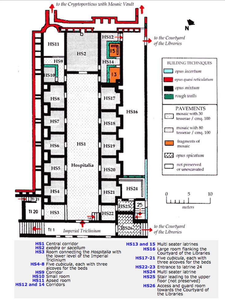The black and white mosaics, the multiple latrines and the secluded position prove that the building belonged to the secondary quarters of the Villa, intended for high-ranking personnel such as praetorians or freedmen.