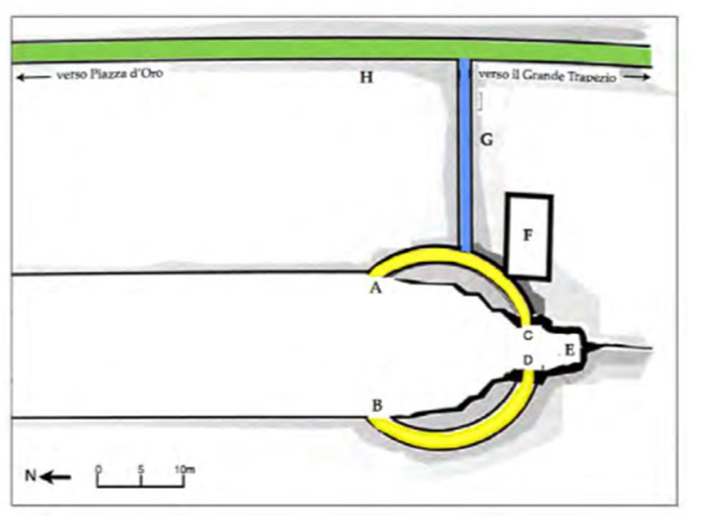 A metà della galleria semicircolare est ha inizio un altro corridoio sotterraneo di servizio G che raggiunge il corridoio H e poi arriva fino al Grande Trapezio.