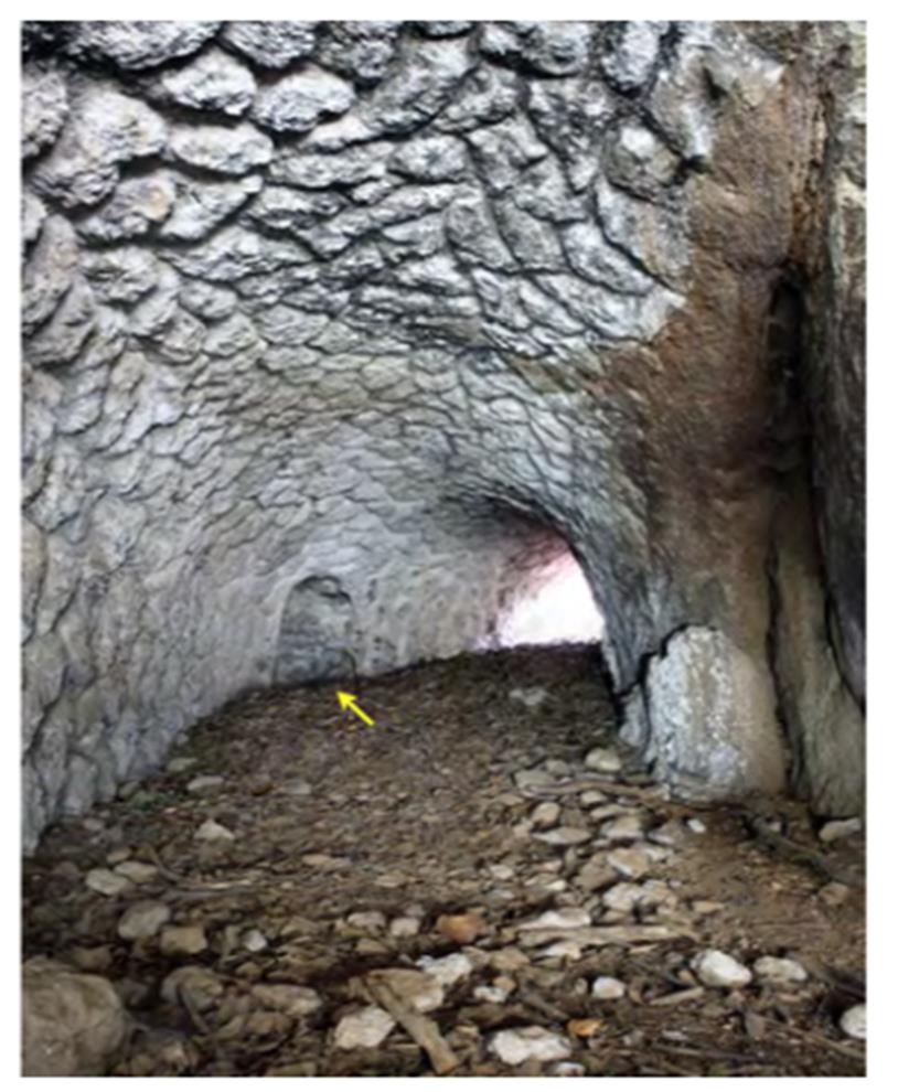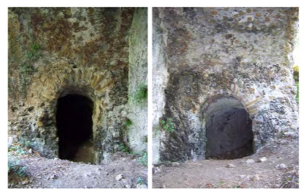 All’interno della grotta le porte C e D danno accesso alle due gallerie sotterranee semicircolari scavate nel tufo, che sbucavano con altre due porte A e B nelle  pareti rocciose della valle, una ventina di metri prima della grotta.