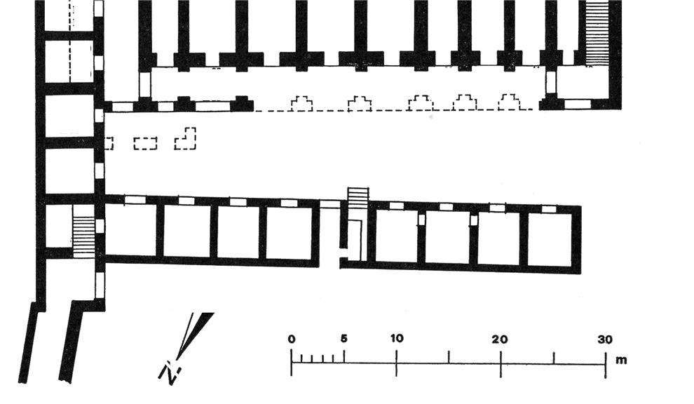 Ha otto ambienti quadrangolari separati da un corridoio centrale sul quale si apre una latrina a più posti.
