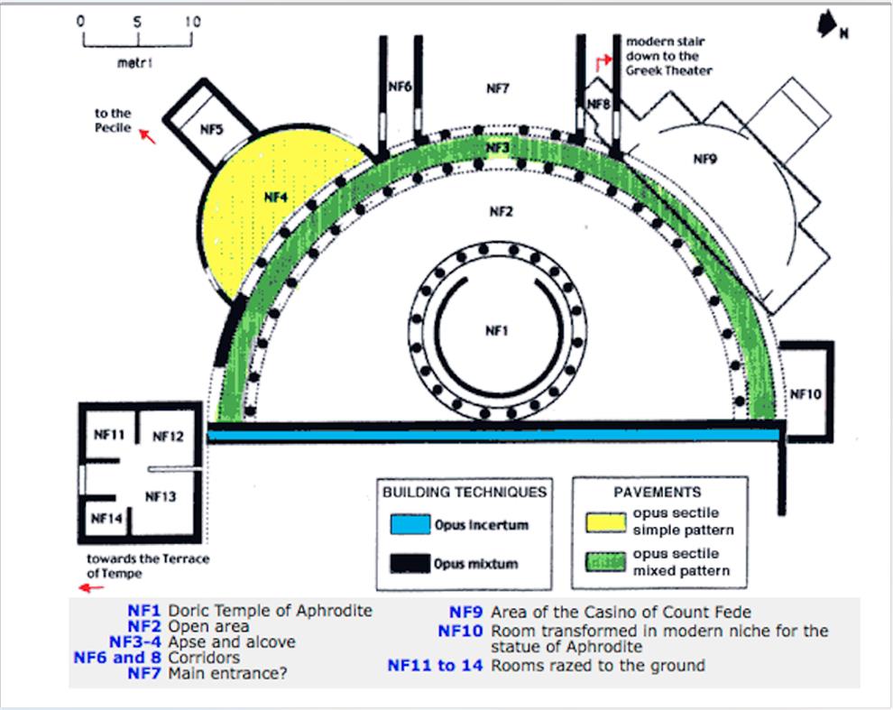 In the center it has a circular Doric temple NF1, which has been partly reconstructed, and is surrounded by a garden area delimited by a semicircular portico NF3.