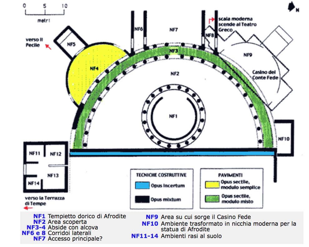 Al centro ha un tempietto circolare di ordine dorico NF1, che è stato in parte rialzato, circondato da un'area a giardino delimitata da un portico semicircolare NF3.