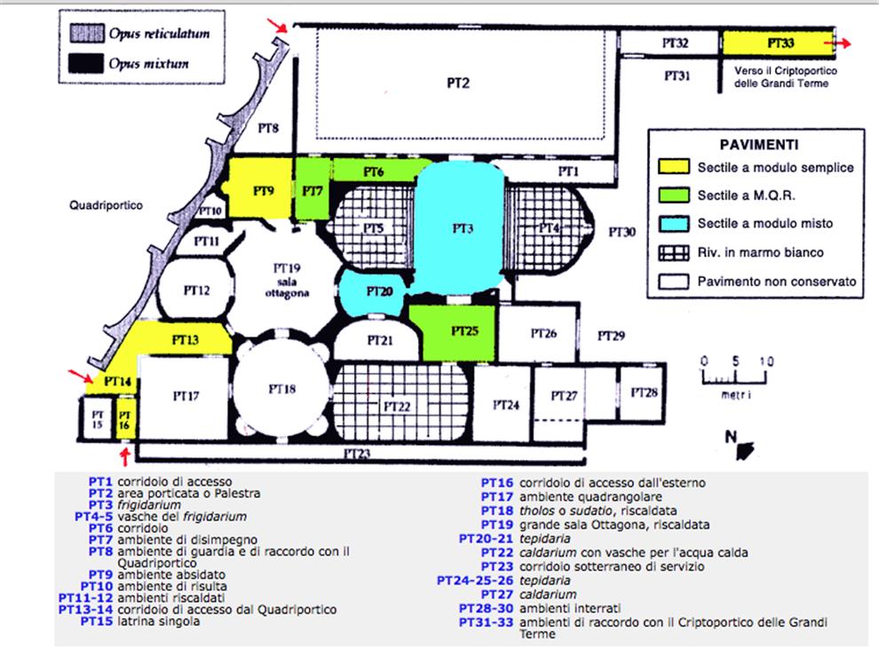 Innanzitutto la grande Sudatio circolare PT18, e poi una serie di ambienti riscaldati, come i tepidaria in PT20, 21 e 25.