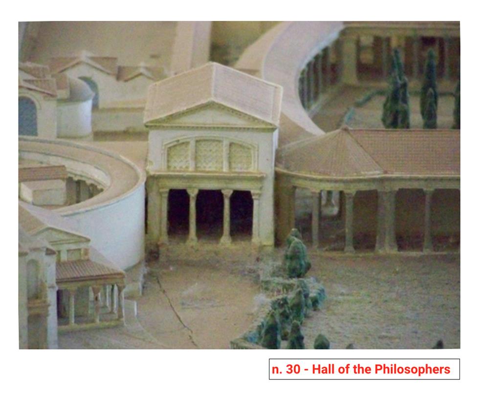Traditionally the Hall of the Philosophers is believed to have been a library, and the seven niches were cabinets for books and manuscripts. Their height of m. 1.60 from the ground denies this hypothesis because they would have been difficult to access; in the niches there are the imprints of the marble slabs on the mortar and no signs of shelves.