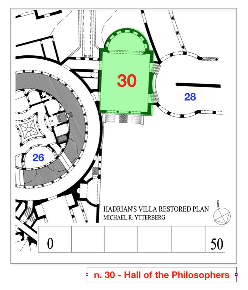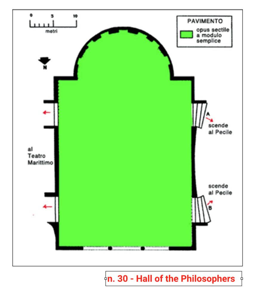 The Hall of the Philosophers owes its name to the seven niches in the apse, as many as the Seven Sages. In the sixteenth century Pirro Ligorio called it "Temple of the Stoics", describing the decoration that he found during his excavations: it was in alabaster and marble, most of all red porphyry, the imperial stone par excellence due to its purple color.