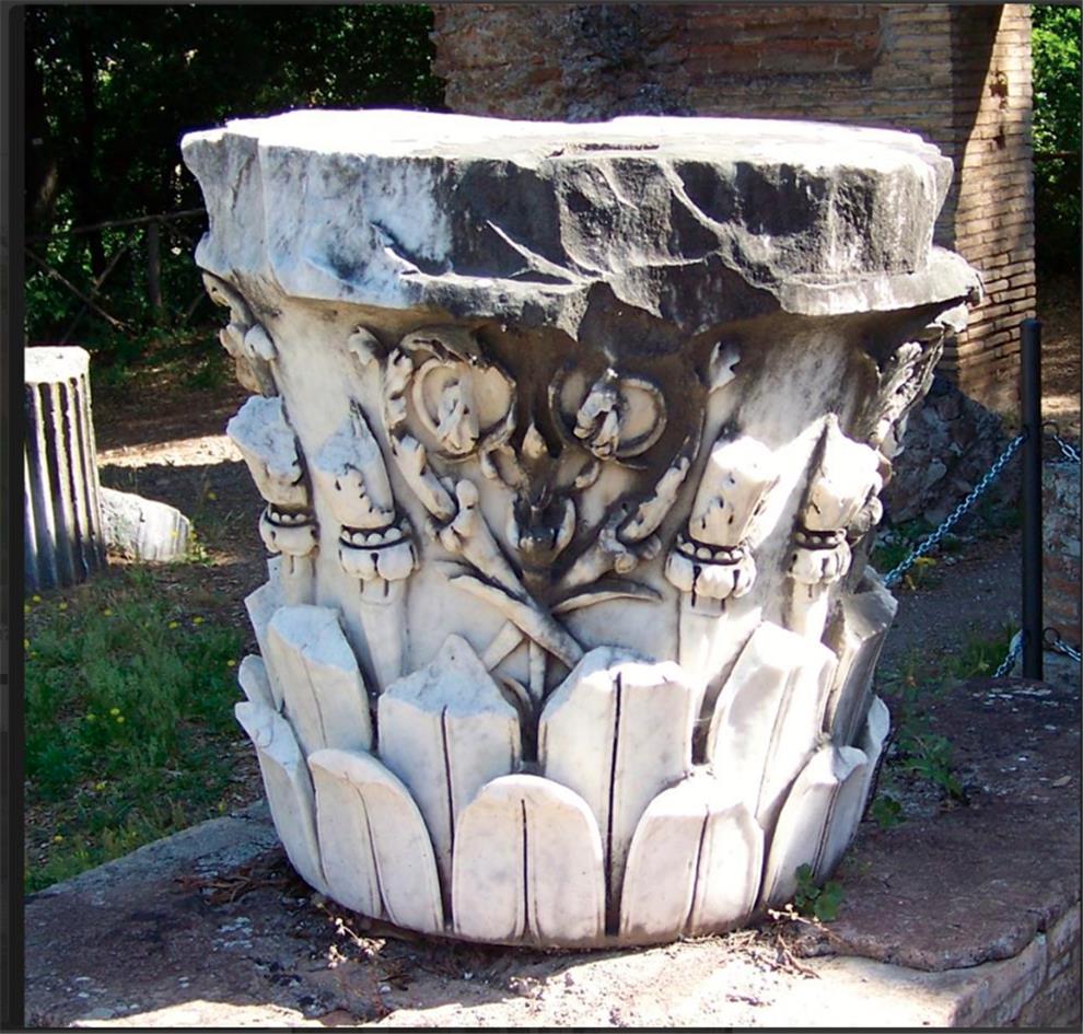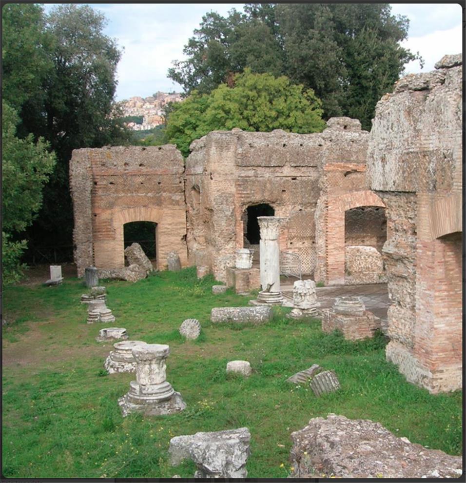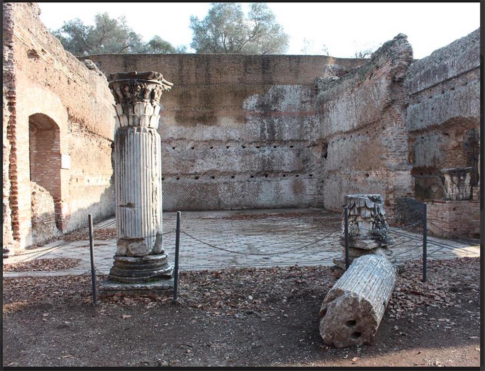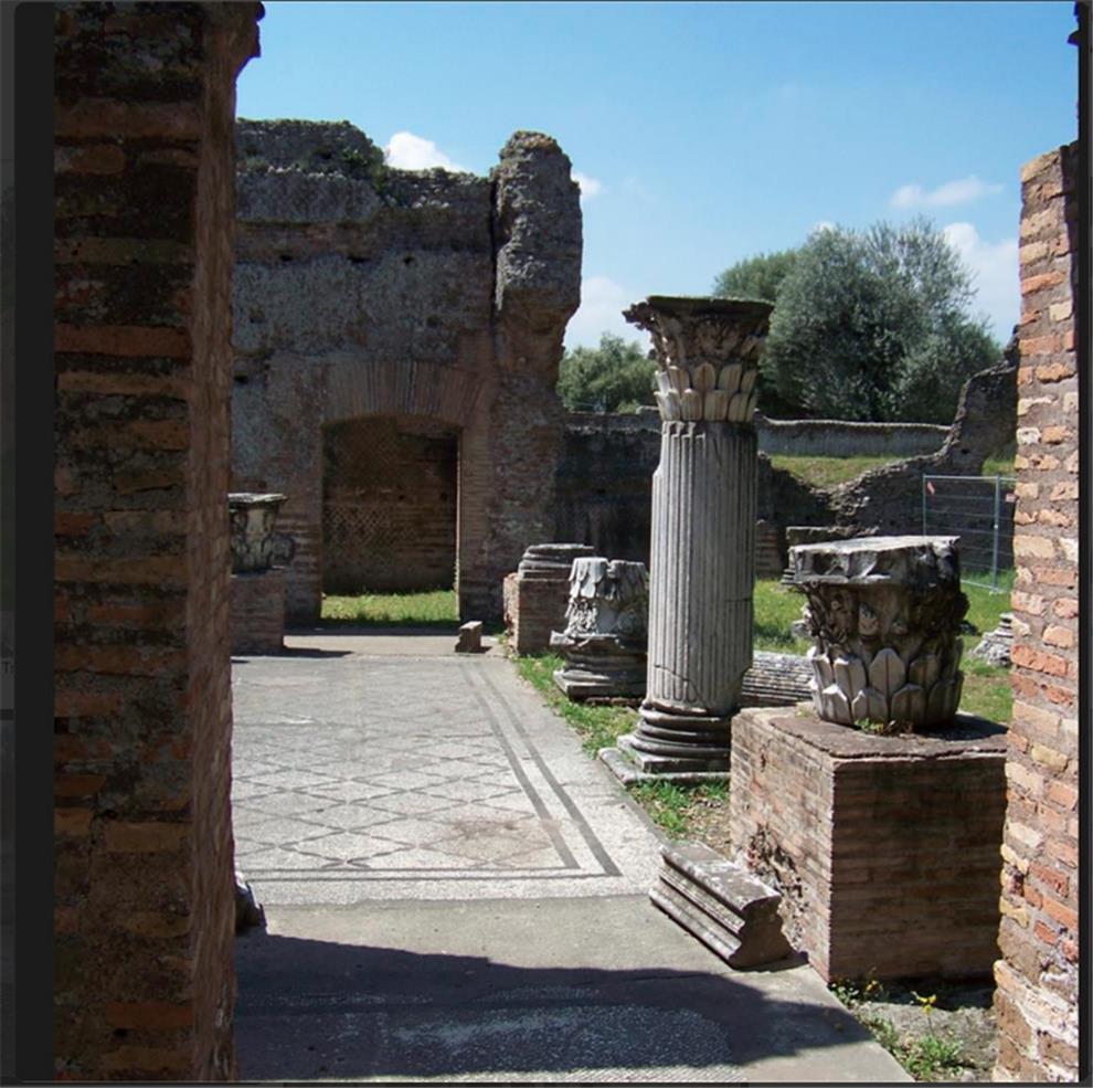 The portico had pillars made of bricks, and the capitals that we see there today do not belong to this building, as Marina De Franceschini studied in the article «Marmi architettonici di Villa Adriana murati per le case di Tivoli» (https://rirella-editrice.ch/schedashop.aspx?idArt=2897)