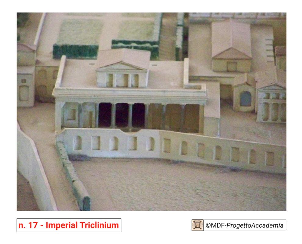 Together with the Hospitalia, the Imperial Triclinium was a single building. It was the living part of the complex, with a vast triclinium, several rooms and a large Cryptoporticus for walking indoors.