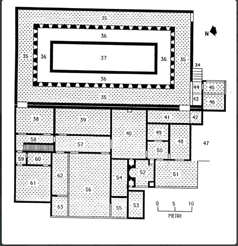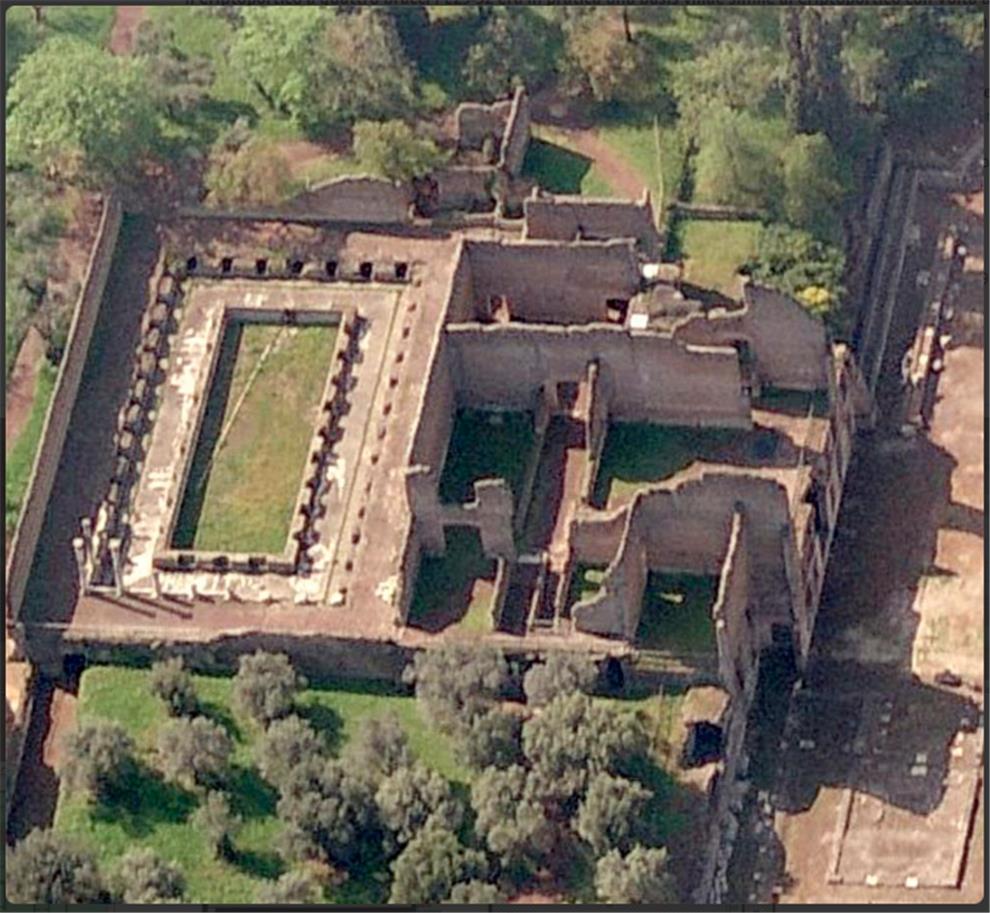 Fishpond and walkway are surrounded by the PE35 portico, which is on a higher level. It was paved in opus sectile, with Corinthian columns and capitals.