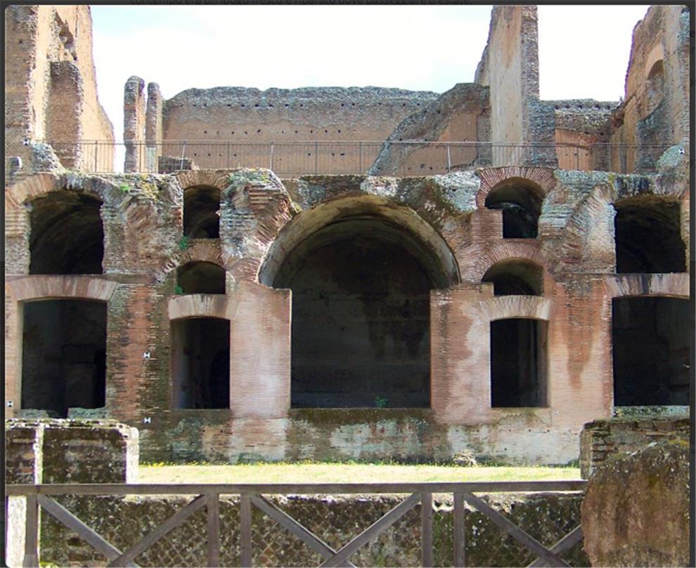 In the large panoramic rooms facing the Garden Stadium, only the lower brick floors (sesquipedali) remain on which the suspensurae once rested, i.e. the small pillars that supported the actual floor which must have been in opus sectile. On the walls there are the traces of large panels and recesses for large marble reliefs.