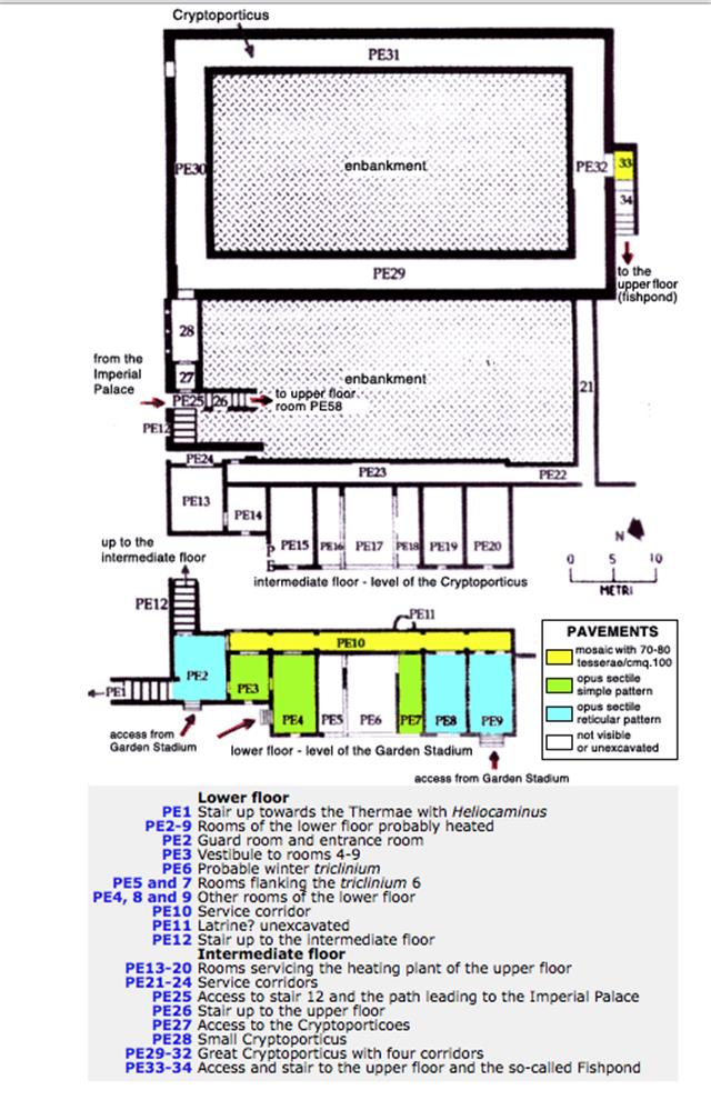 All the rooms open towards the Garden Stadium had large windows and were paved in opus sectile, except the rear corridor PE10, which had a simple mosaic floor.