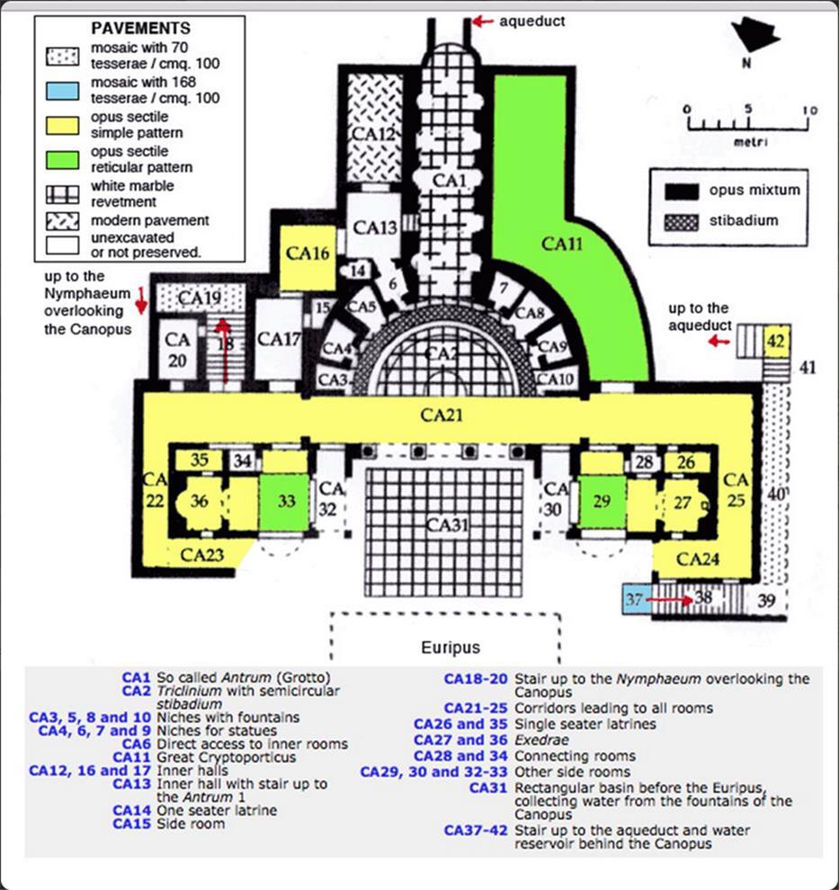 The Canopus was mainly paved in opus sectile, the basins, fountains and water channels were revetted in white marble. The walls were covered in marble and the dome had traces of colored mosaic.