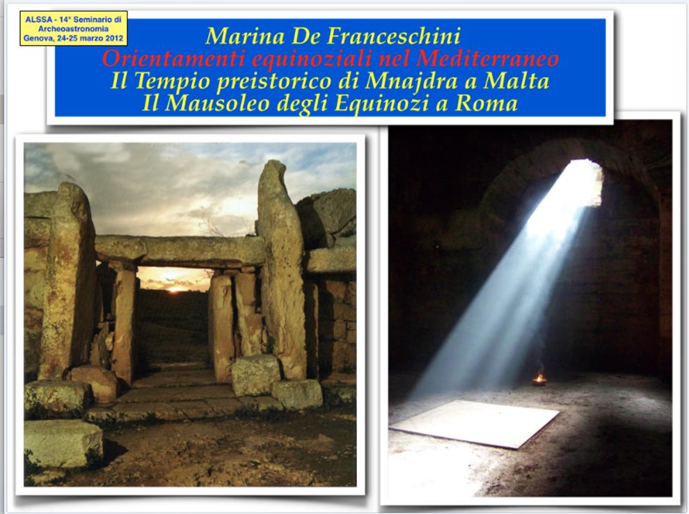 Orientamenti equinoziali nel Mediterraneo: il tempio preistorico di Mnajdra a Malta e il Mausoleo degli Equinozi a Roma. (Italian Language)